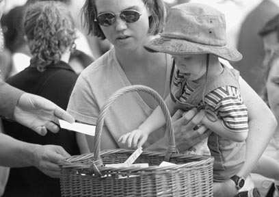 Erin N. Sweeney SM ‘01 and son, Ian, drop a written prayer into a basket at a Student Center yesterday’s vigil, held to reflect on the recent terrorist attacks.