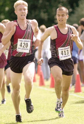 Albert S. Liu '02 sneaks a peek at Benjamin A. Schmeckpeper '05 while racing to the finish line in last Saturday's UMass Dartmouth Invitational. Liu and Schmeckpeper ran personal bests of 26:04.75 and 26:04.18, respectively, clinching MIT's victory over 25 other schools in the region.
