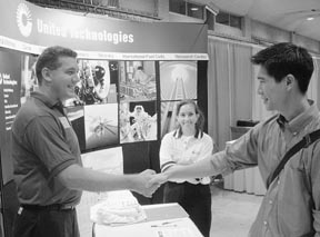 A representative from United Technologies shakes hands with a student during Thursday's Career Fair. Over one hundred companies staffed booths at the event.
