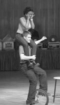 Sinbad the Juggler takes an audience member on a unicycle ride during last Saturday night’s Comedy Collage.