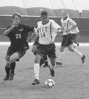 Adan M. Mandujano ’05 steals the ball from a State University of New York-Plattsburgh player at last Saturday’s soccer game. MIT tied SUNY 1-1 in overtime.