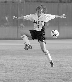 Shirley Chan ’04 traps the ball in yesterday’s 5-1 win over Curry College. Chan scored one of the Engineers’ five goals, bringing MIT’s record to 8-2.