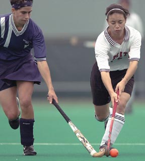 Dribbling in for a shot, Amy C. Lin ’02 shields the ball from a Mt. Holyoke defender during last Saturday’s 1-0 loss.
