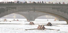 An armada of rowers passes the Western Avenue Bridge as it makes its way down the Charles River.