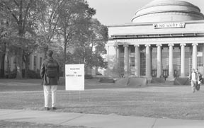 MIT students create a mock refugee camp on the steps of the Student Center and erect a tent city on Killian Court to protest the United States-led bombing in Afghanistan. The protest, held at noon yesterday, was simultaneously conducted at several schools around the country.