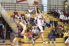 Danny Kanamori ’05 makes a reverse layup to help the Engineers win 66-65 over Suffolk University.