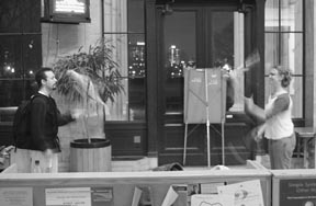 Jason Paul and Christina Dancz while away an evening juggling at MIT. Jugglers from around the Cambridge area meet every Sunday between 3:30 and 6:30 in Lobby 10 to practice and play.