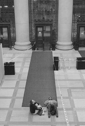 Dan Corson ’05 and Amanda Beeson ’03 admire the newly renovated Lobby 7.
