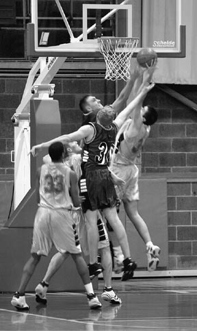 Adam Gibbons ’05 (left) and Boris Paskalev '03 (right) go for a rebound last Tuesday against Babson College. MIT lost the game 45-58.
