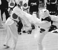 In the sparring competition, the divisions are broken down into black belts, color belts and white/yellow belts, and schools form teams of three (consisting of a lightweight, middleweight, and heavyweight). The respective weights spar two-round matches against each other and winning two of the three rounds advances the team in a single elimination fashion. Points are scored by executing a strong kick that displaces the body, or demonstrating a controlled kick to the head.