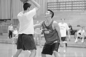Rich Park ’05 defends against Oneil Bhalala ’05 in the B League IM basketball finals last Thursday in Rockwell Cage. Theta Chi took home the title, defeating Phi Kappa Theta 39-25.
