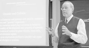 Institute Professor and Nobel Laureate Phillip A. Sharp speaks about the McGovern Institute for Brain Research. The new research laboratory for neuroscience, to be located at the corner of Albany and Main Streets, is scheduled to open by the end of 2004.