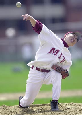 Inhan Kang ’05 delivers a fastball in the first game of a double header against Wheaton University. MIT lost both games, 13-3 and 5-0.