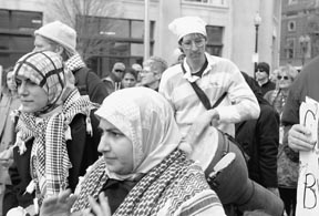 Martin A. Hunter plays his drum during a protest in support of Palestine held in downtown Boston last Saturday.