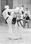 The tournament day began with forms competition, where each student performed a choreographed set of techniques to be judged on merits such as grace, balance, power, and agility. Christina S. Park ’02 started off the points tally by placing second in the women’s black belt division. Dora Z. Kelle ’03 also placed second in the women’s white/yellow belt division, her first medal this year.