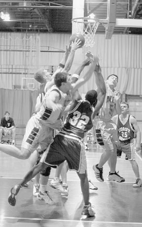 A mass of players scrambles for a rebound at MIT's net during Tuesday night’s game against the U.S. Coast Guard Academy. MIT won 64-51.