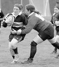 As the clock ran down to the last seconds of the half, scrumhalf Sarah L. Daigh ’03 pulled the ball from the scrum for a quick weakside play, scoring a try and bringing the halftime score to 15-0.