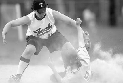 Shortstop Erin L. Hult ’04 tags out a Worcester Polytechnic Institute runner on a steal attempt at second base in last Saturday’s doubleheader. MIT won both games, 9-1 and 10-2.