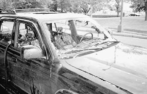 A burnt car on Memorial Drive.