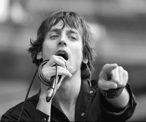 Lead singer Rain Maida of Canadian rock band Our Lady Peace gestures toward the audience from the main stage.