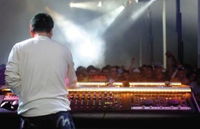 Spinner Paul Oakenfold performs for an enthusiastic audience in the rave tent, in the parking lot next to CMGI field.
