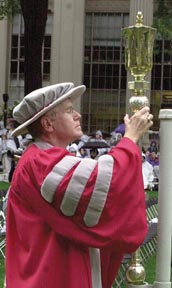 L. Robert Johnson '63, president of the Alumni Association, places the ceremonial mace on its stand during the procession.