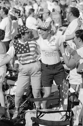 MIT Police Sgt. Cheryl Vossmer dances with a friend to Barry Manilow’s classic “Copa Cabana” as part of Boston’s Fourth of July celebration.