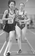On the track, star of the day Mealani K. Nakamura G ran both the 1500m and 1000m and slaughtered her personal records in both events. In the 1500m run, Nakamura started out strongly and finished strongly, passing a number of competitors on her way to a second place finish. Nakamura took over 10 seconds off her time in the 1500m to finish officially in 5:23.91. In the 1000m run, Nakamura repeated her success, as she again took seconds off her time to finish in a fourth place time of 3:26.52. Also setting personal records on the track were Jelena Spasojevic ’02 in the 1500m run and Jennifer A. Gaugler ’05 in the 1000m. Spasojevic finished in 5:40.79 and Gaugler took seventh in 3:31.37. In the 3K, Jessica E. Karnis ’05 and Patricia M. McAndrew ’03 finished in seventh and eighth respectively with personal record-breaking times of 12:15.82 and 12:23.52.