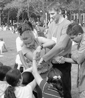 Freshmen attempt to extricate themselves from the “human knot” during an Orientation activity yesterday.