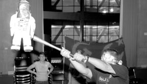 Playing Hardball--A freshman takes a cut at an astronaut pinata with President Vest’s face. The Vest pinatas were part of the East Campus activities at the Residence Midway.