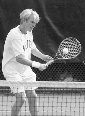 Evan Tindell ’06 returns the ball Saturday in a match against the University of Vermont.
