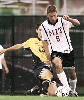 Midfielder Doug Allaire ’04 evades a defender’s tackle during Thursday’s soccer match. MIT posted a 5-0 victory over Wentworth.