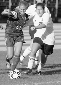 Sheila E. Saroglou ’03 and Toni Pantuosco of Babson fight for possession of the ball during the first half of the women’s soccer game against Babson on Tuesday. MIT won 2-0.