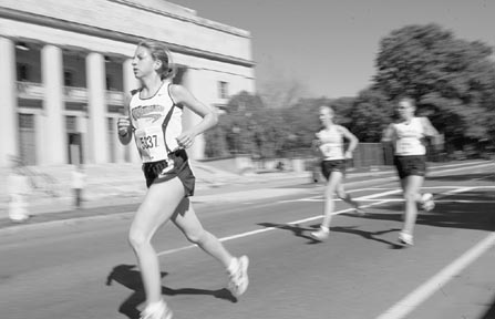 Runners make their way past Walker Memorial in Monday’s Tufts Health Plan 10K for Women. Over 5,000 runners participated in the annual race.