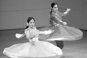 Alpana Waghmare (left) and Meenakshi Verma perform in a Kathak Dance Concert sponsored by MITHAS. The concert featured Pandit Chitresh Das.