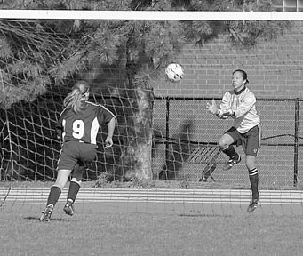 Goalie Connie Yang ’03 blocks a shot during last Sunday’s game against Mount Holyoke College. The MIT Engineers won 2-0, bringing their season record to 8-4-1.