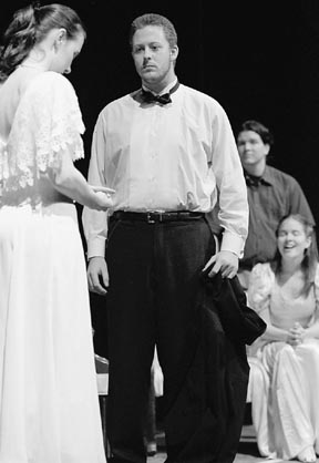 George Kittredge (Arthur G. Fitzmaurice G) scolds Tracy Samantha Lord (Cinda Lavely) for her behavior in the Musical Theater Guild’s Fall 2002 production of High Society.
