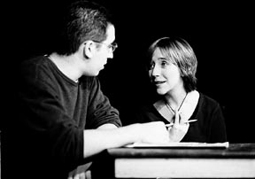 Alex (Jamie J. Carreiro ’05, left) talks about crosswords with Jessica (Laurel L. Ruhlen ’06), a cafe waitress.