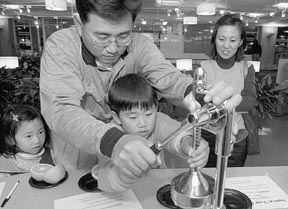 Dong and Sue Que watch intently as their father makes juice at the Club Z “Squeeze Your Own Juice” event last Friday.