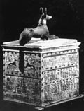 Artifacts not to be missed in The Quest for Immortality are the boat from the tomb of Amenhotep II, an eight-foot wooden model of the pharaoh’s river ship, the canopic chest of Queen Nedjmet, which once held her internal organs, the granite lid of the massive sarcophagus of Nitocris, the sculpture of the god Osiris, wrapped as a mummy with a gold and electrum headdress and shown with his head lifted in the process of resurrecting, and the many beautiful gold and jeweled items discovered in the royal tombs at Tanis, including the gold funerary mask of the courtier Wenudjebauendjed, which is exquisite.