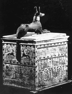 Nedjmet’s canopic chest, decorated with a statue of Anubis, contained her internal organs after mummification.