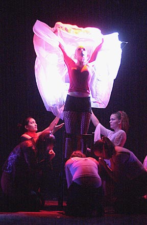 rene M. Rahman ’06 and Alycia G. Hillman ’03 kneel on either side of the glowing figure of Amber R. Jaycocks ’04 in “Worship.”