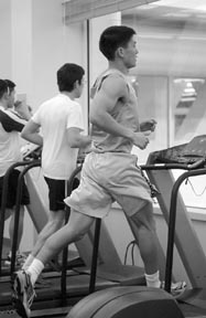 Kyle R. Steinfeld G and Chester K. Bai G work off a few calories on the Zesiger Center treadmills. Creators of the CycleScore iCampus project hope to make exercising on machines in the Z-Center a more interactive and competitive experience.