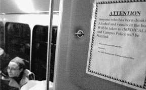 SafeRide drivers recently posted this sign in new buses used for both the Tech Shuttle and Saferide after several vomiting incidents raised concerns about cleanliness and safety.