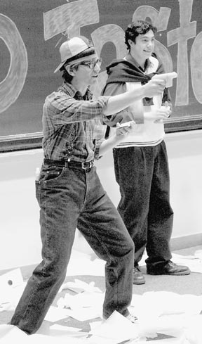 Daniel O. Bates ’05 retaliates against a rowdy audience using the traditional Bad Taste weapon: a disc gun.