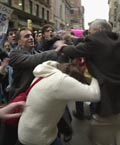 A truck of construction workers brandishing an American flag yelled “support our troops” back at the protesters. Nothing came from the confrontation but heated words, a result common to most of the acrimonious encounters during the protest.