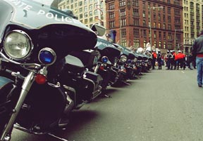 A formation of State Police motorcycles lines the street at Government Center.