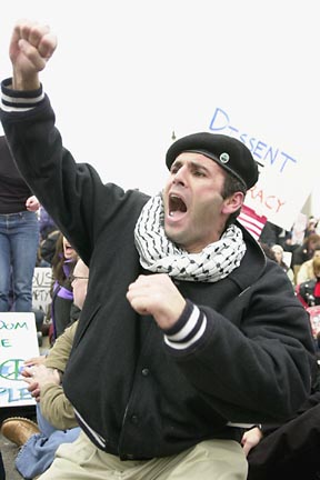 Palestinian rights activist Amer Jubran shouts against war on the Harvard Bridge during yesterday’s march.