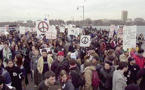 Over 2,000 demonstrators march across the Harvard Bridge to voice their opposition to the U.S.-led war in Iraq.