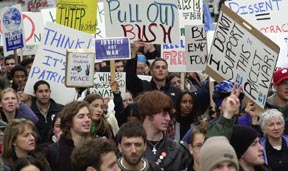 A mass of anti-war protesters surges down Boylston Street yesterday waving signs. The march included over 2,000 students from area colleges including MIT.